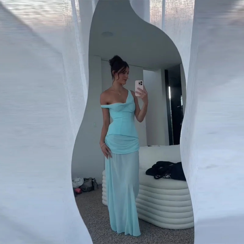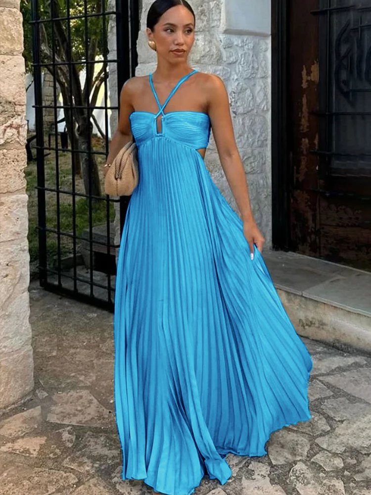Blue Pleated Halter Long Dress Women Solid Sleeveless Backless Lace-up Maxi Dress Summer Chic Beach Vacation Party Vestidos Robe 65,44 $