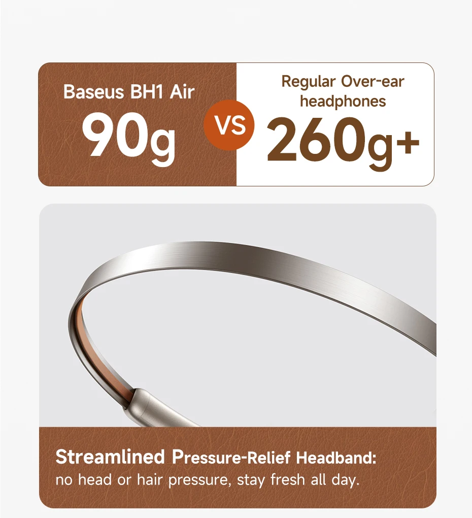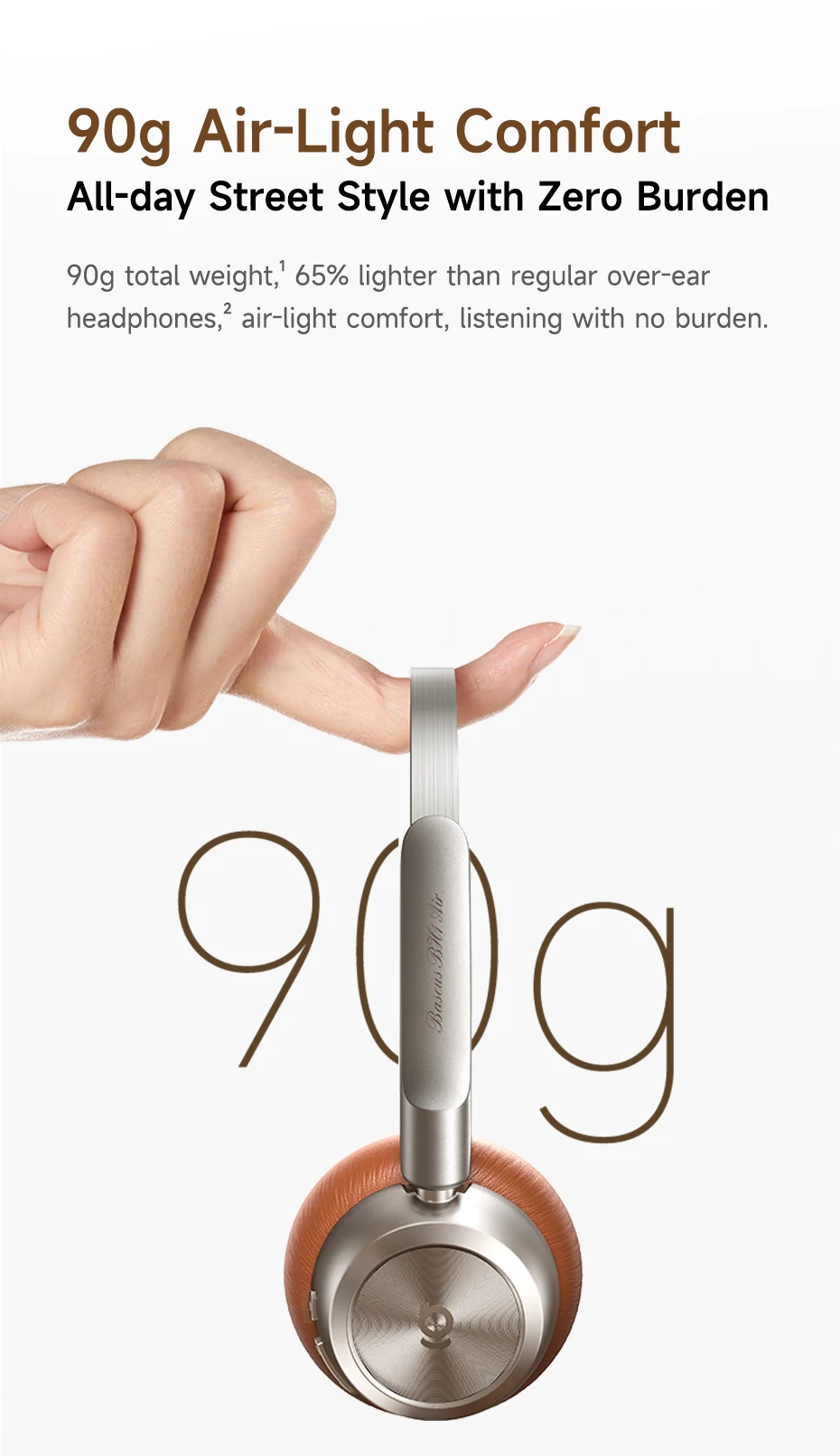 90g total weight, 65% lighter than regular over-ear headphones, air-light comfort,listening with no burden.