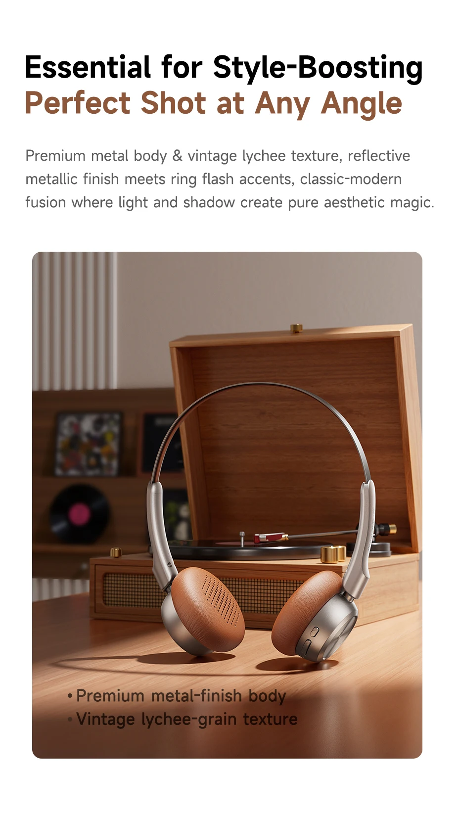 Premium metal body & vintage lychee texture, reflective metallic finish meets ring flash accents, classic-modern fusion where light and shadow create pure aesthetic magic