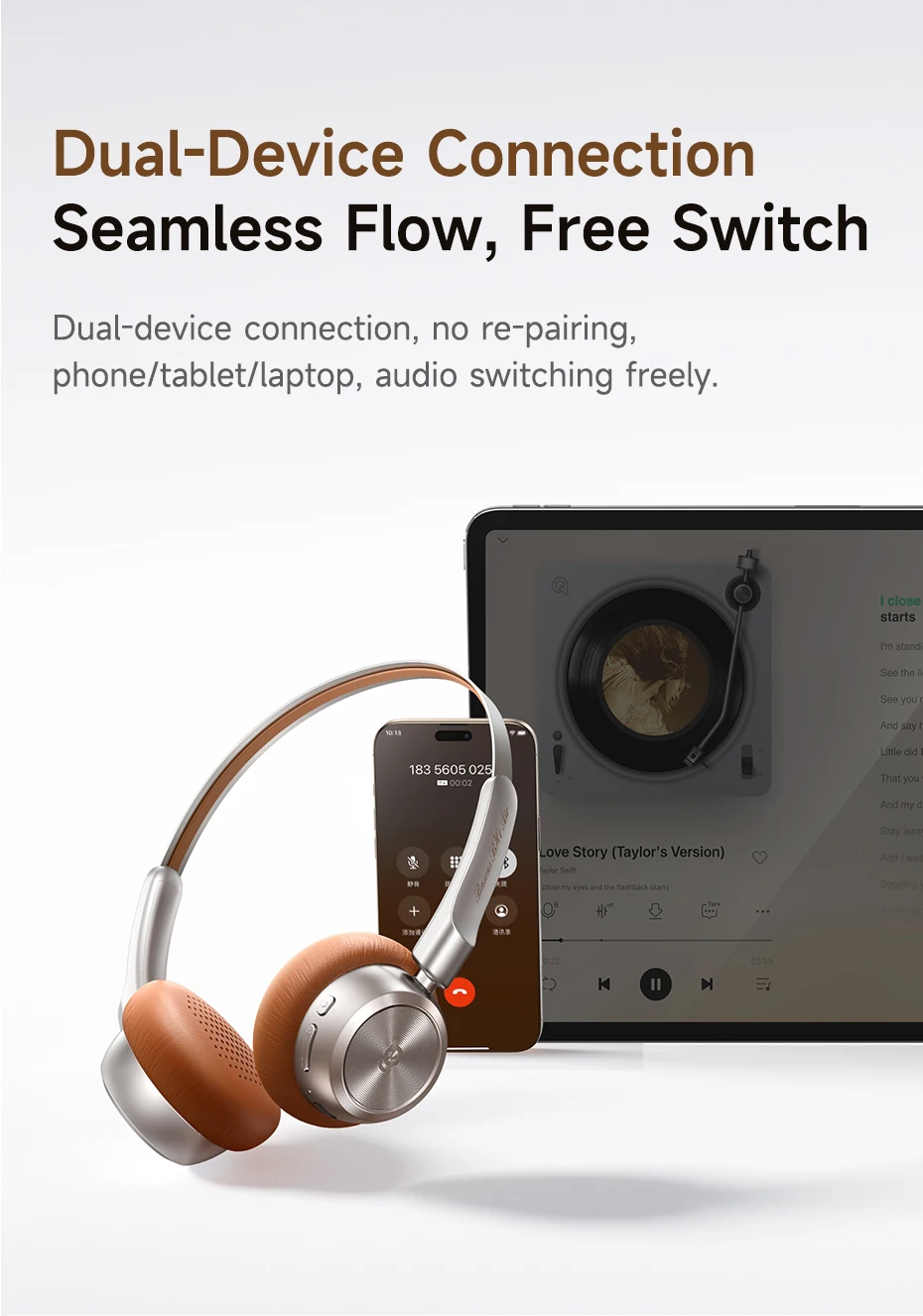 Dual-device connection, no re-pairing, phone/tablet/laptop, audio switching freely.