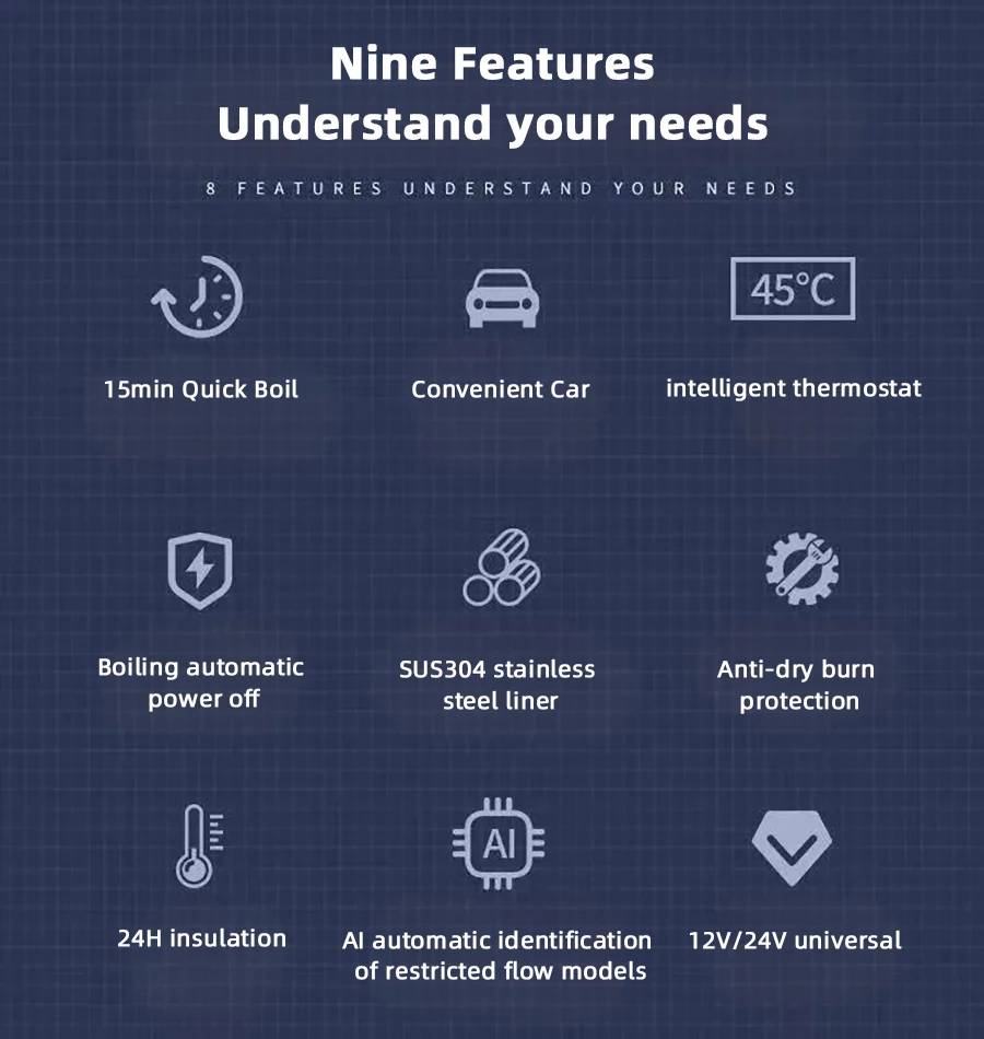 Suitable for all kinds of vehicles, including cars, trucks, power supply can be 12V~24V, can be boiled in 15 minutes (100 degrees Celsius).