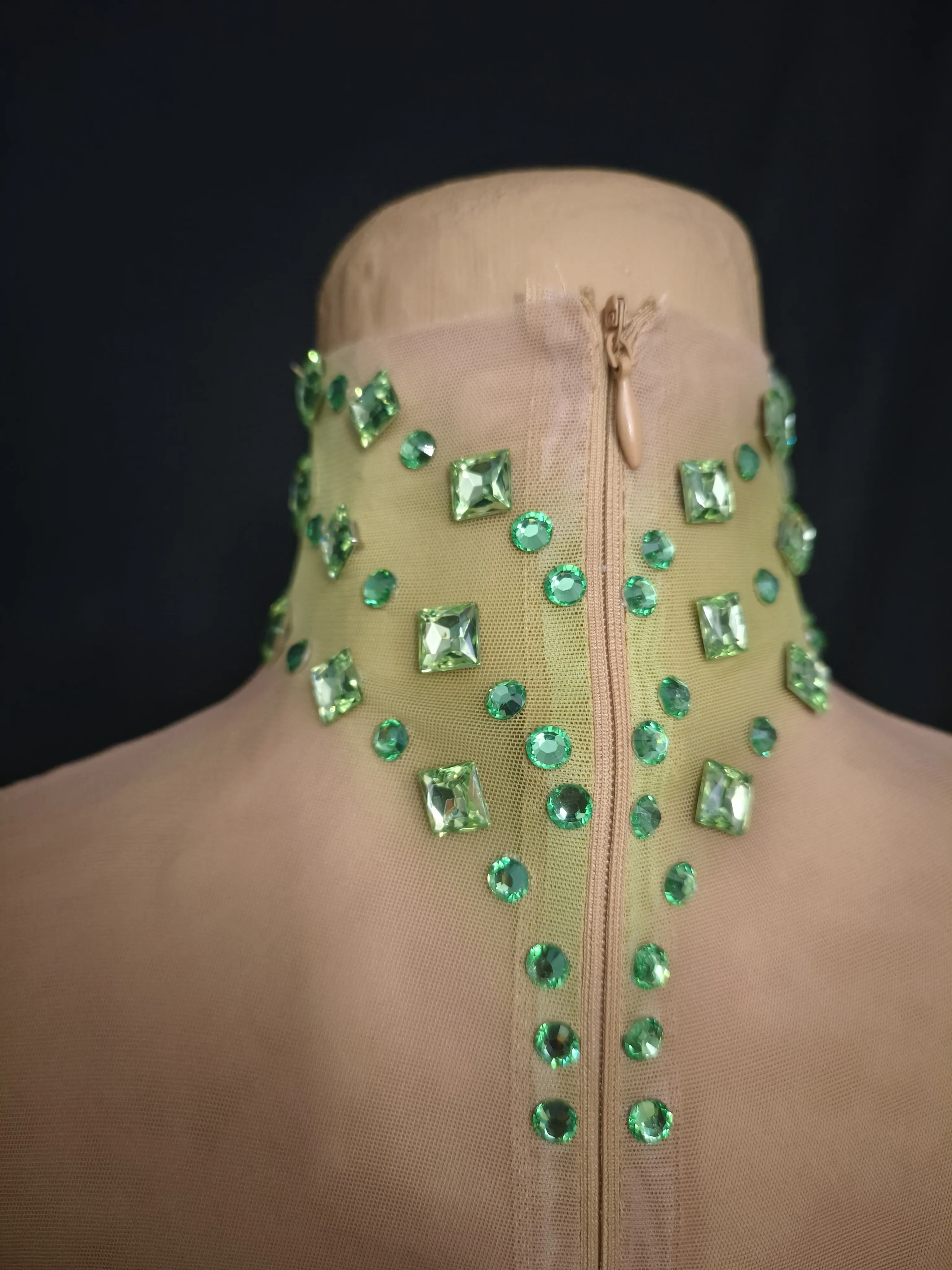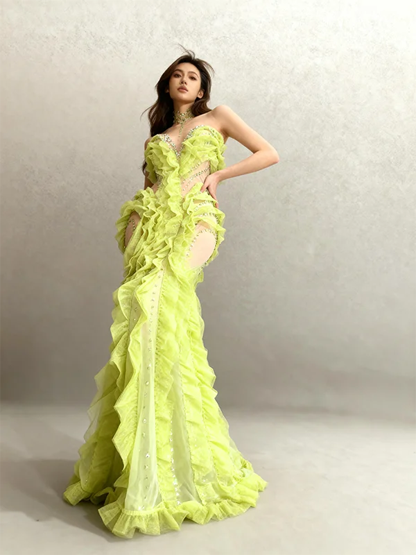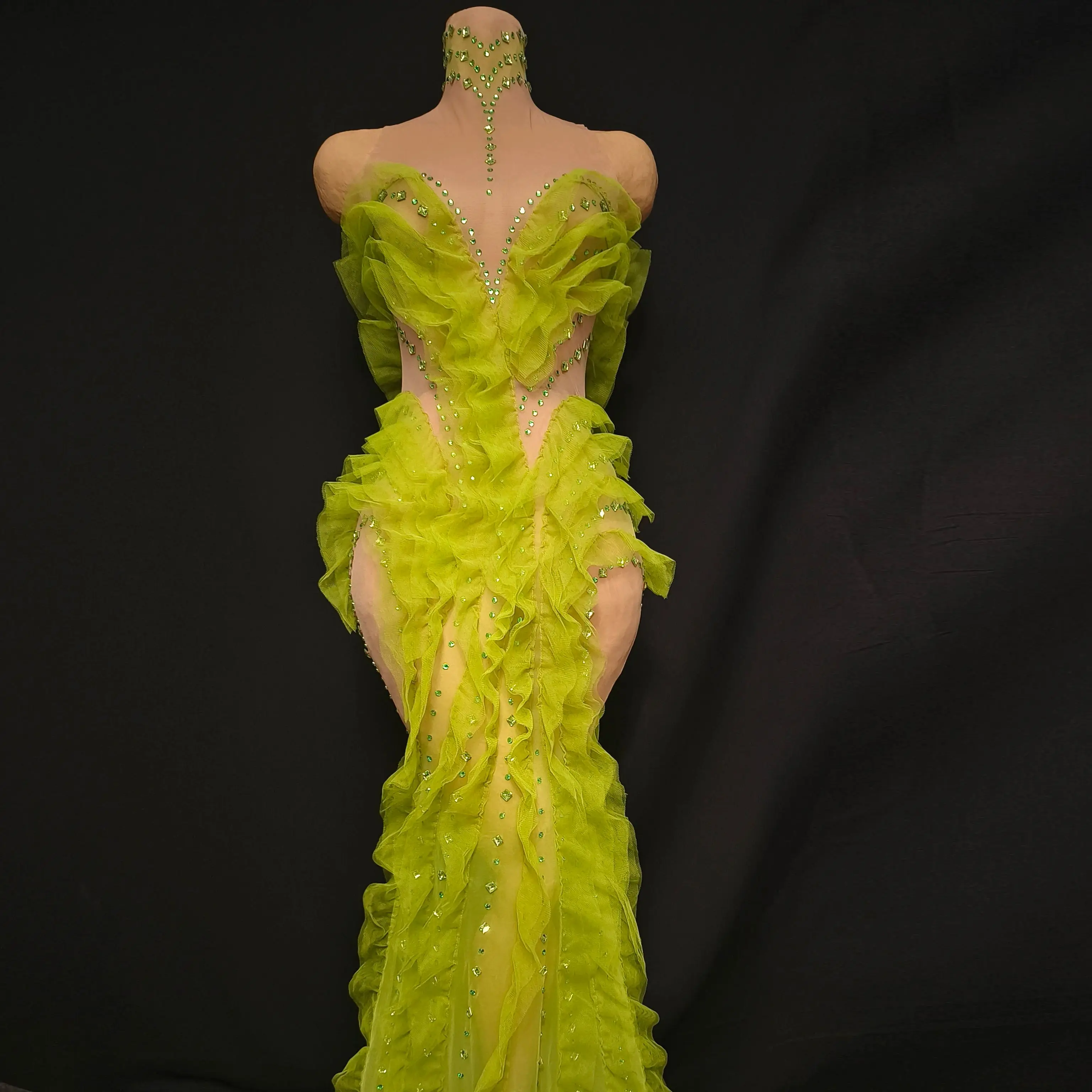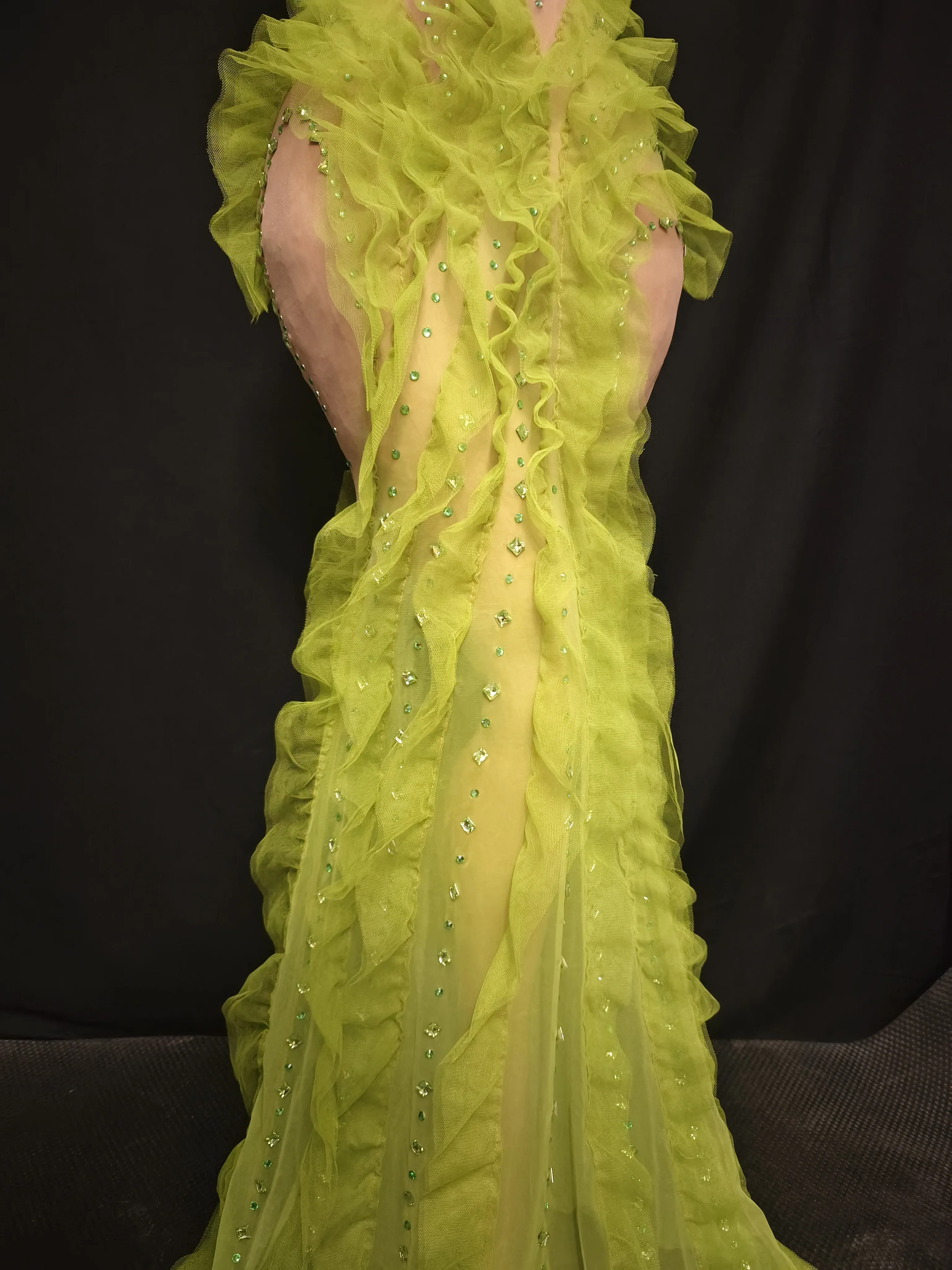 Elegant Sparkly Green Rhinestones Mesh Sheer Ruffle Maxi Dress Celebrate Eveing Birthday Party Nightclub Red Carpet Stage Wear
