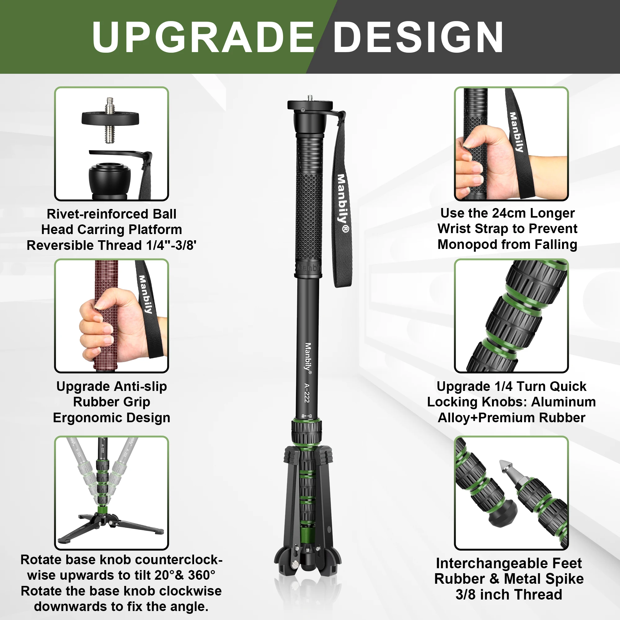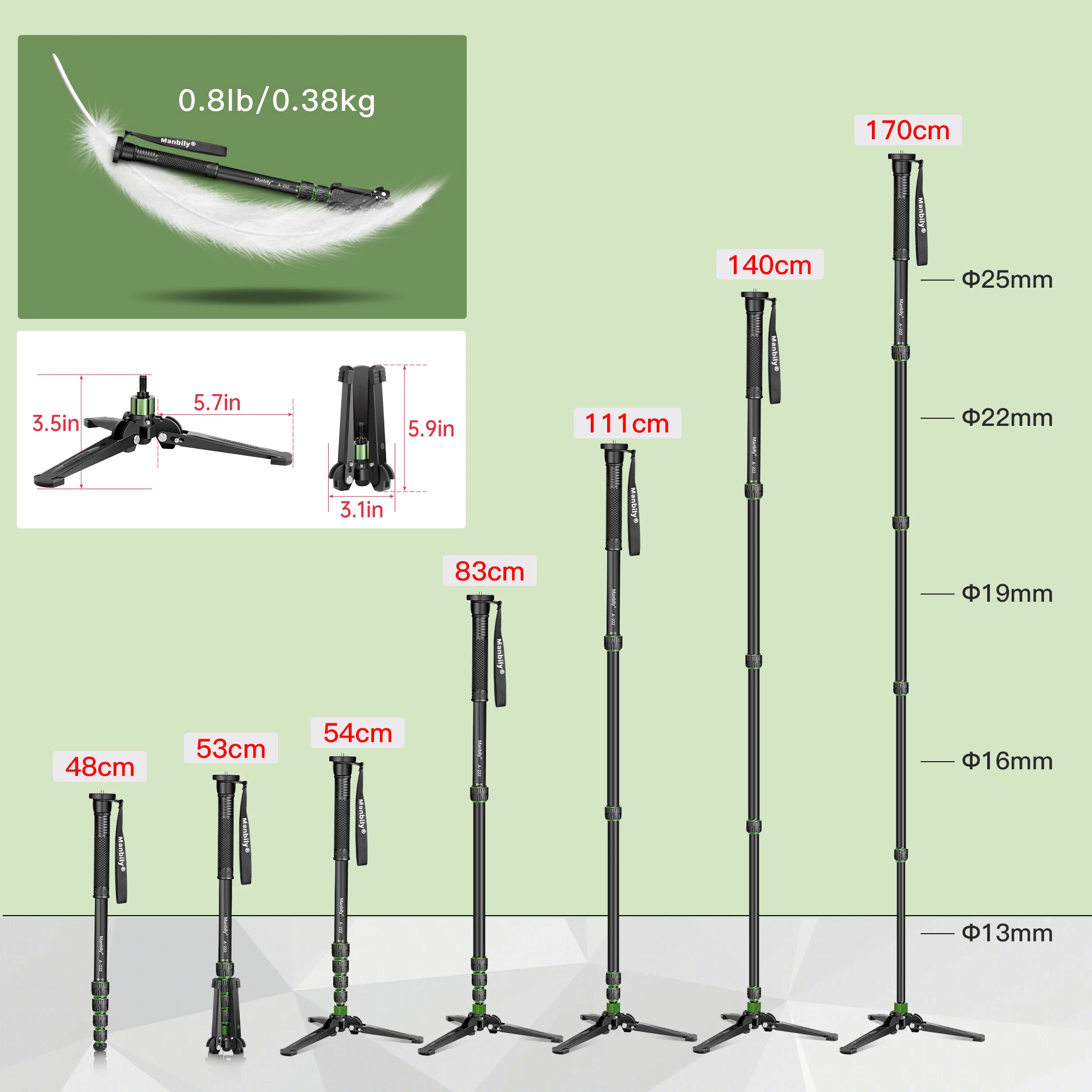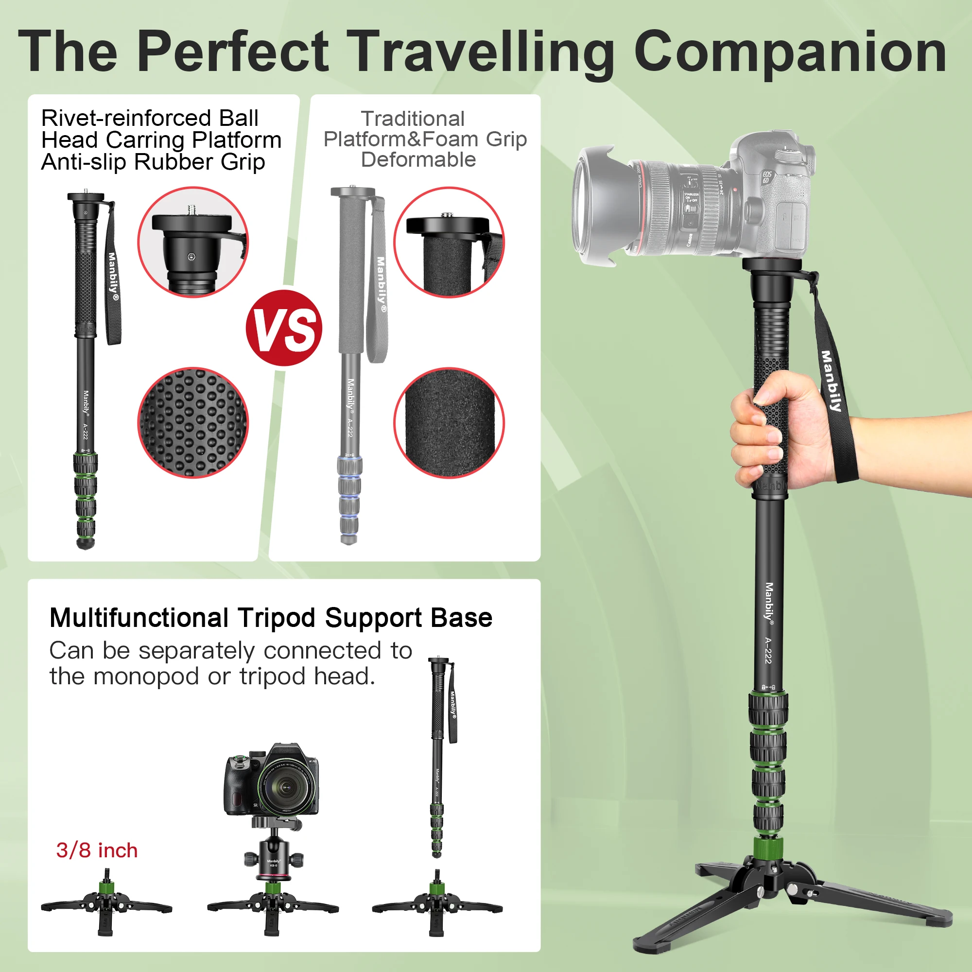 Camera Monopod: The Manbily A222PRO travel monopod weighs only 672g and folds down to 54cm, making it an ideal travel, sports, and wildlife photography companion – compact and lightweight