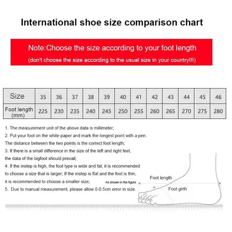 Veuillez lire attentivement notre tableau des tailles! Cela peut vous aider à choisir la bonne taille en fonction de la longueur de votre pied. Veuillez noter que si vos pieds sont trop longs ou trop larges, veuillez choisir une taille au-dessus d’une taille habituelle