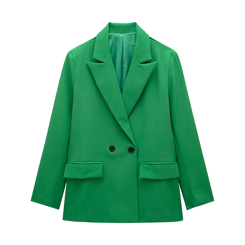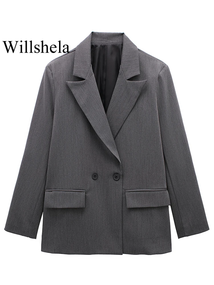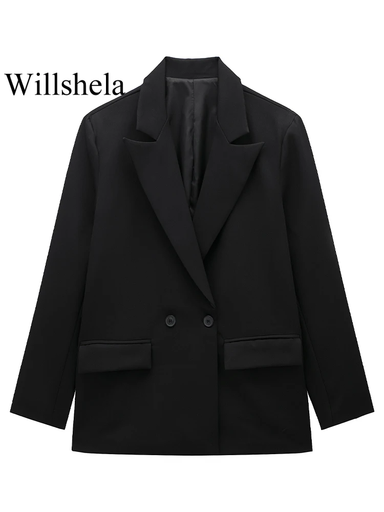Willshela Women Fashion With Pockets Solid Double Breasted Blazer Vintage Long Sleeves Notched Neck Female Office Lady Outfits