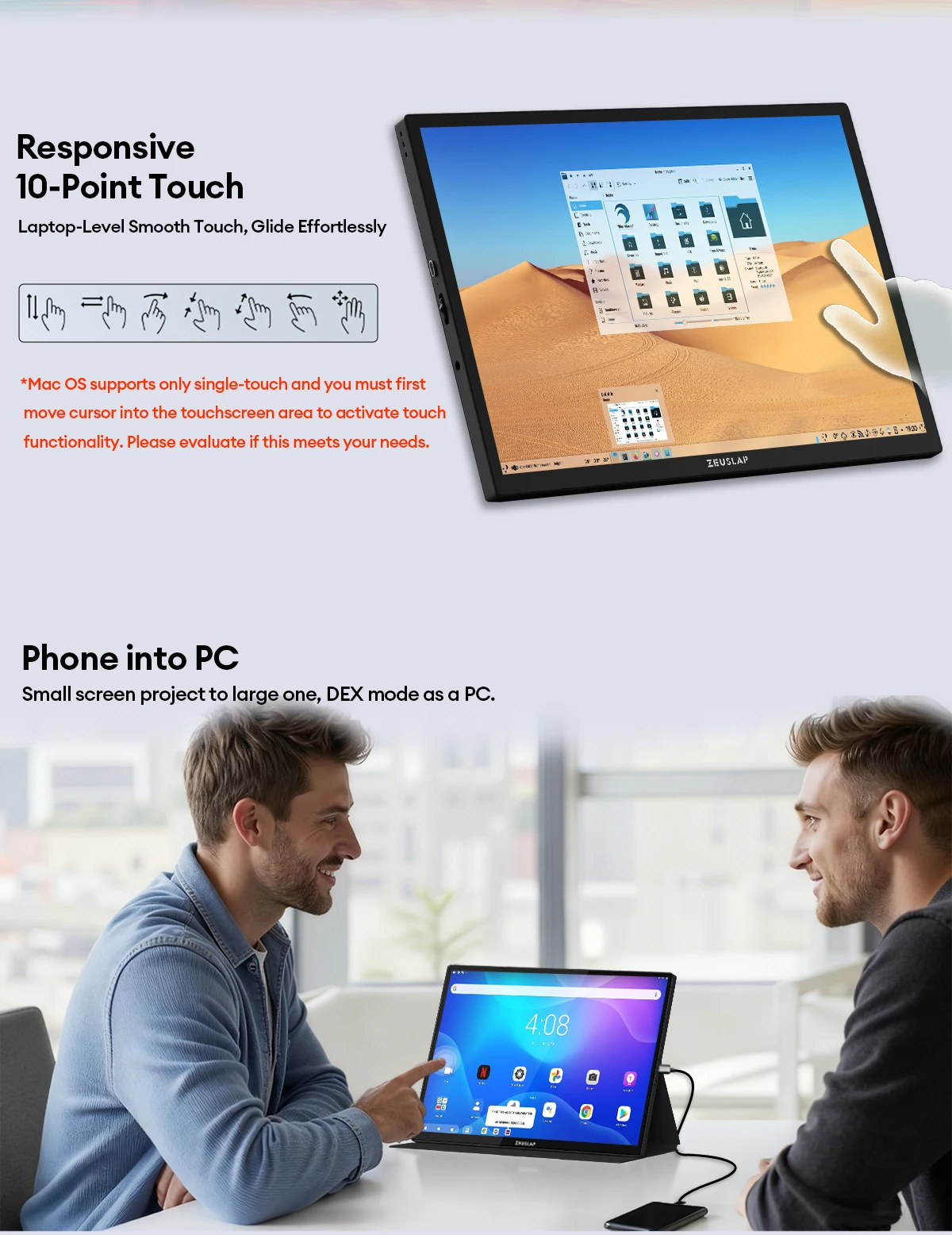 Laptops: Windows (10-point multi-touch) and Mac OS (1-point touch).